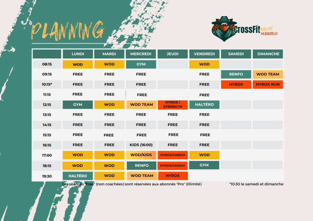 Remarque importante ! Dans le planning, vous lirez le mot “FREE” à plusieurs reprises. Ces moments signifient que nos adhérent.es s’entraînent sans l’encadrement d’un coach. Elles ne sont pas accessibles pour la séance d’essai.